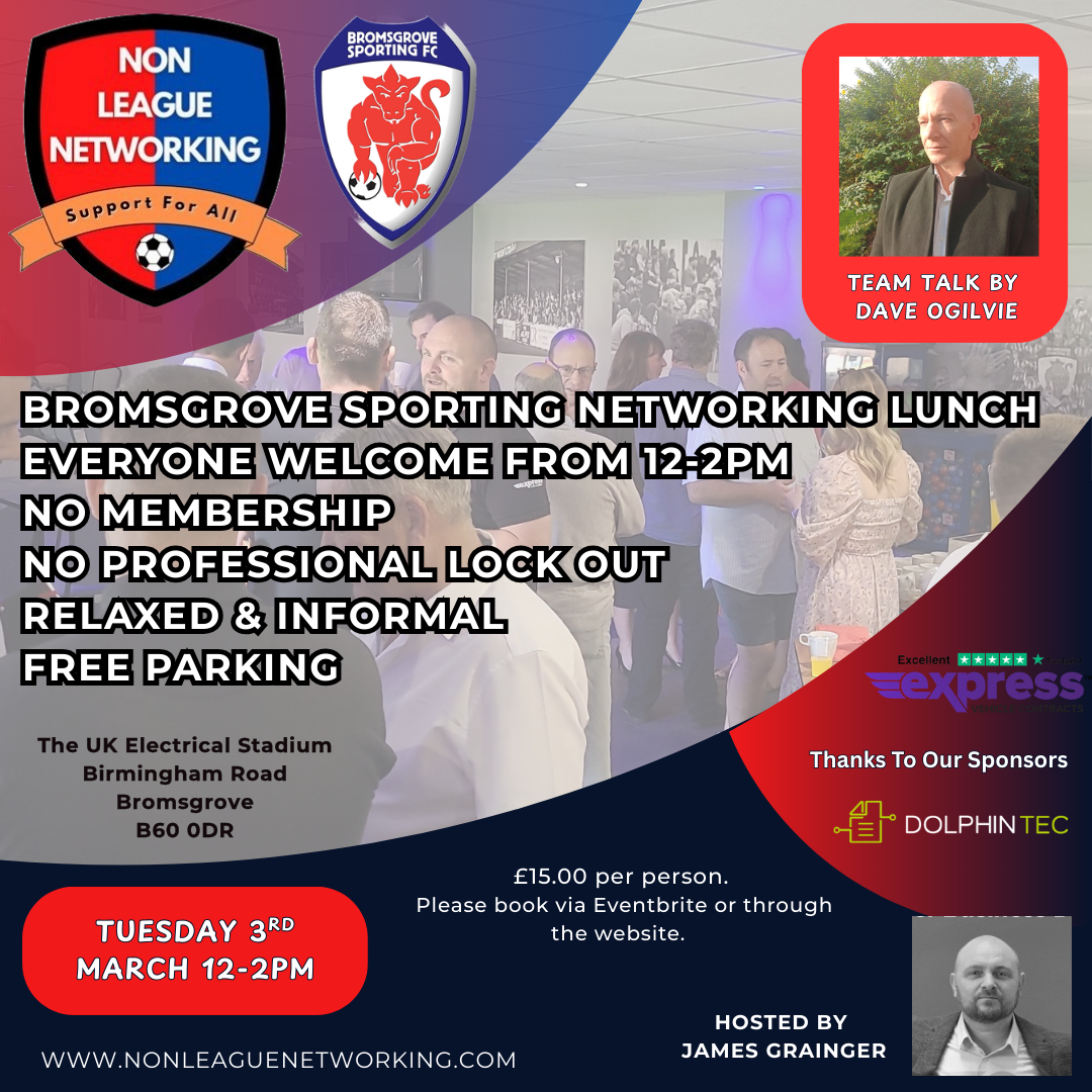 Non League Networking is a local business that hosts networking lunches at Non League football clubs around the Midlands to connect local business owners and professionals with each other to create partnerships and refer business. December offers an after work schedule rather than lunchtime. The meetings are very informal and relaxed and are open to ... |