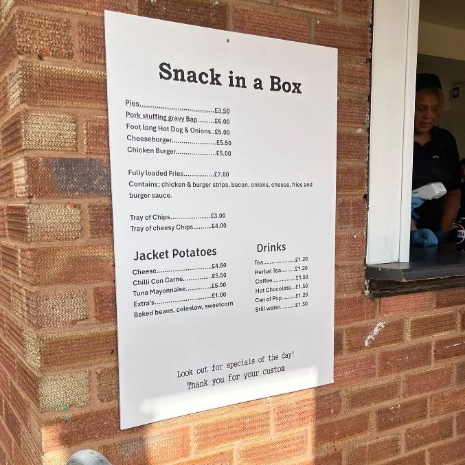 Looking for something to eat at the game? Then look no further than our Snack in a Box offering – a menu can be found in the photo below!