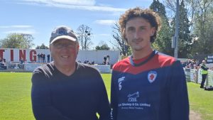 Prior to Monday’s game against Halesowen, midfielder Kyle Belmonte celebrated winning Player of the Month for March. Kyle’s sponsor for the season is club volunteer Chris Curtis – he was represented